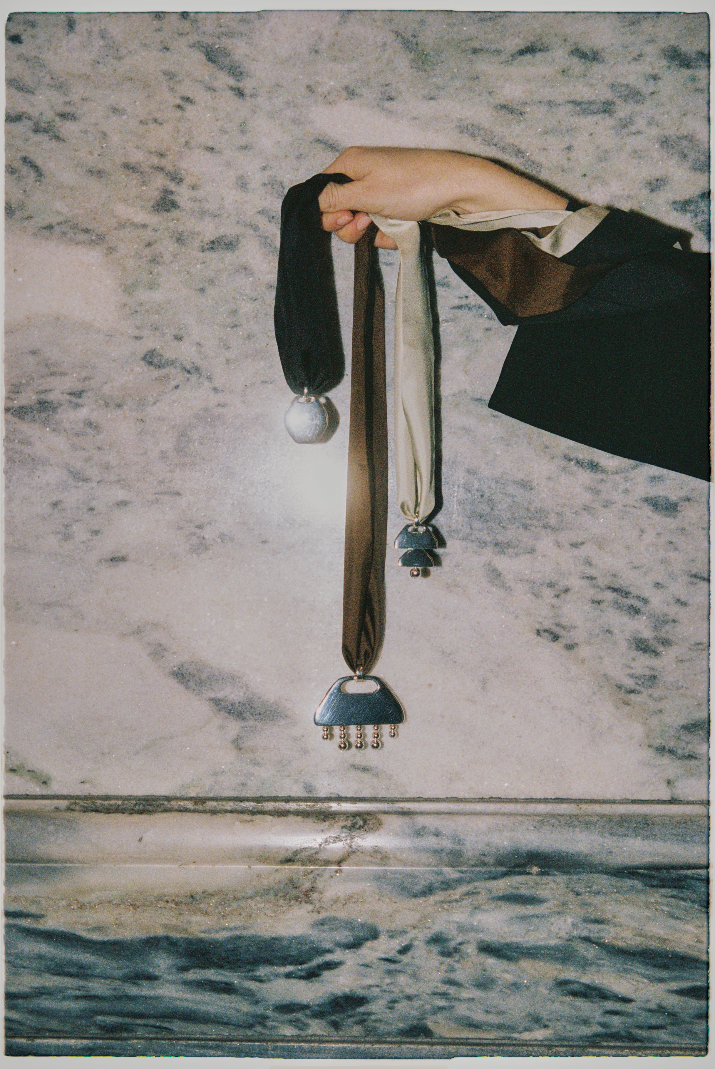 Crafted from pure twill silk, Ravn scarves are designed to softly frame and highlight the jewelry. Their fluid texture and subtle sheen complement clean, minimal silhouettes and allow for versatile styling. Tied at the neck, in the hair, around the wrist, or on a bag.