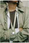 Made from pure silk, this scarf redefines the way you wear your pendant. Its fluid texture and subtle sheen gives a refined softness to any look. Whether tied neatly at the neck or worn loosely, it brings a modern, understated edge to your jewelry styling.
